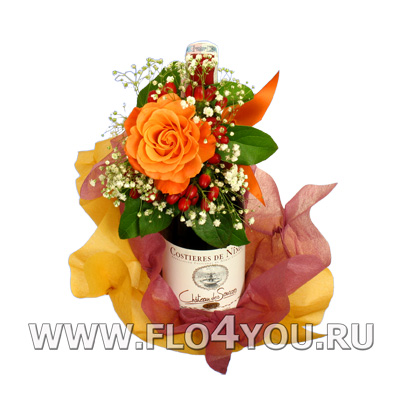 Бутылка вина офорлена живыми цветами и фетром. Стоимость вина не входит в оформление.