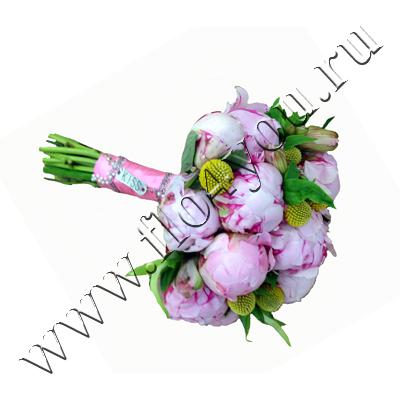 Букет невесты из розовых пионов собран на своих стеблях и задекорирован атласной лентой.
