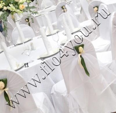 Оформление стульев - шапочка из белого фатина + бутоньерка из цветов.