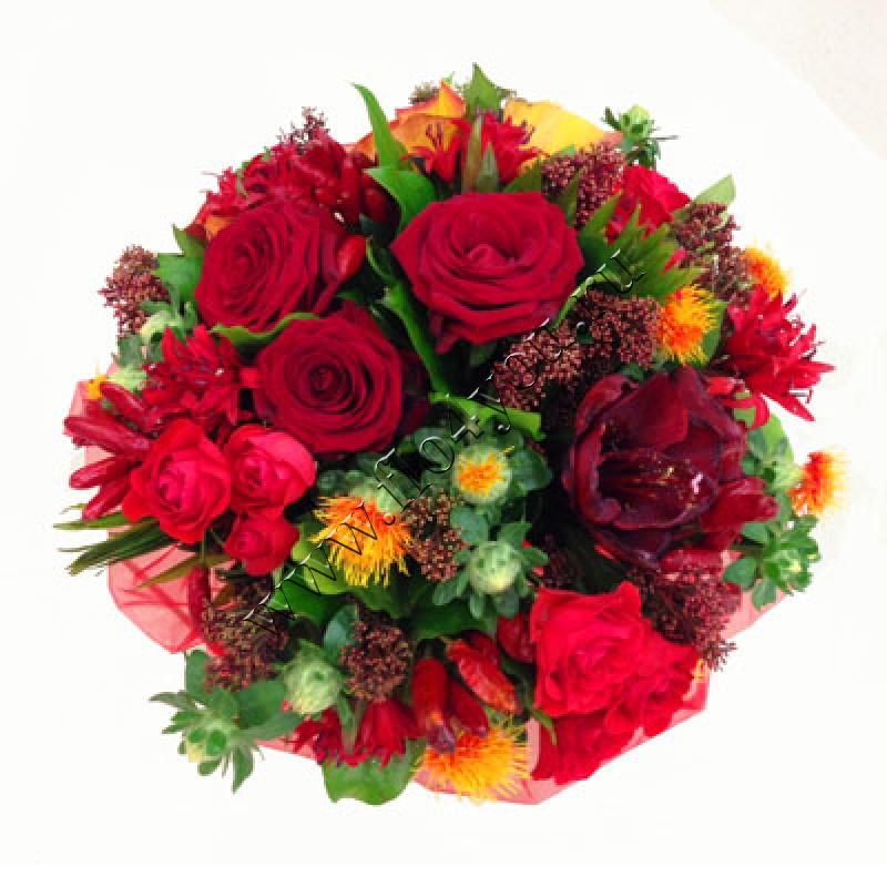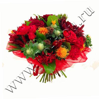 Букет собран из роз и экзотических цветов. Упаковка - органза.