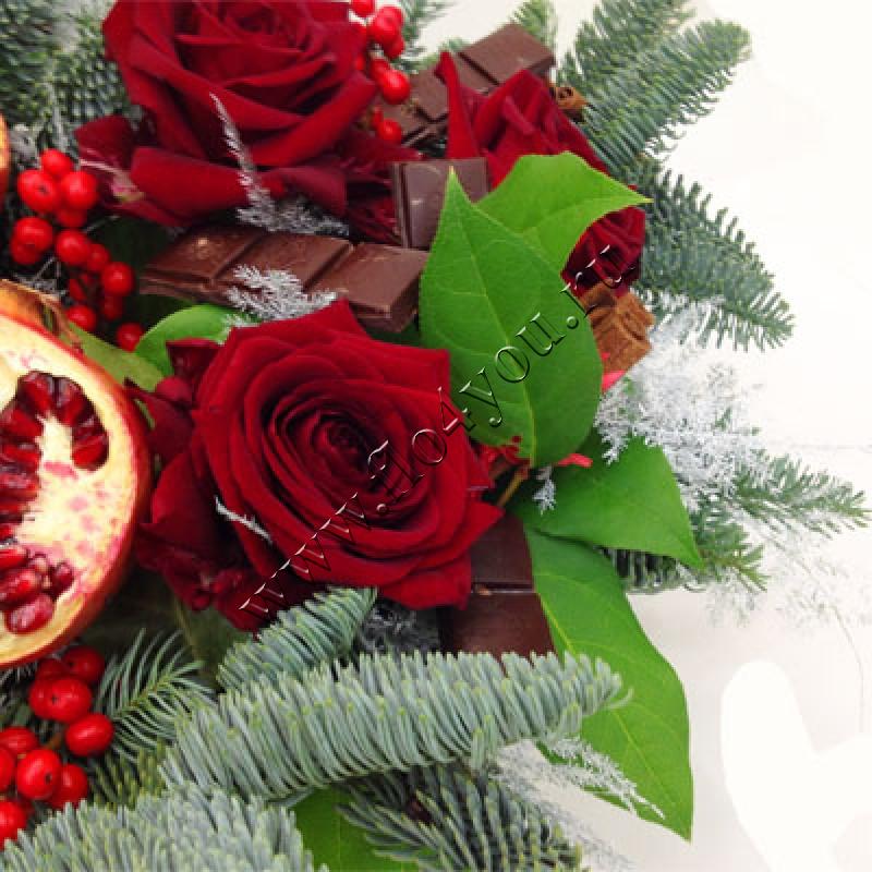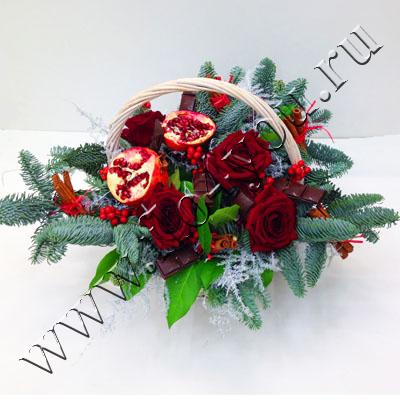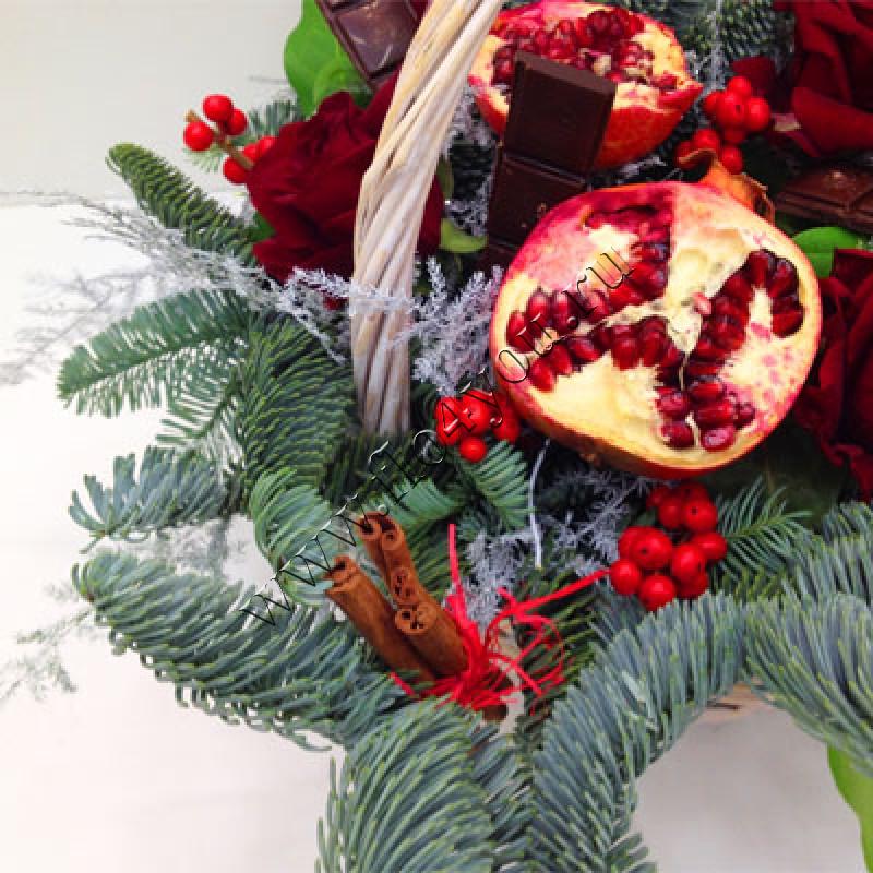Изысканная корзинка с живой елью, настоящим гранатом и шоколадом - неповторимый подарок к Новому году и Рождеству