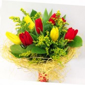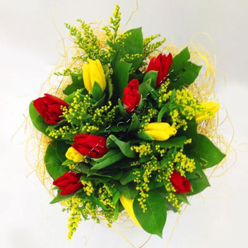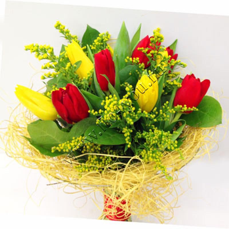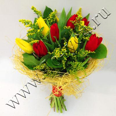 Яркий букетик из желтых и красных тюльпанов - гарантия хорошего настроения.
