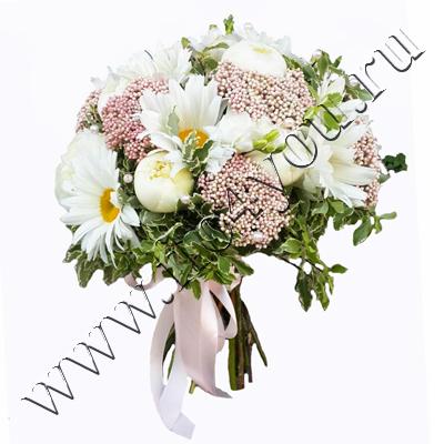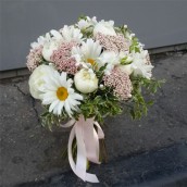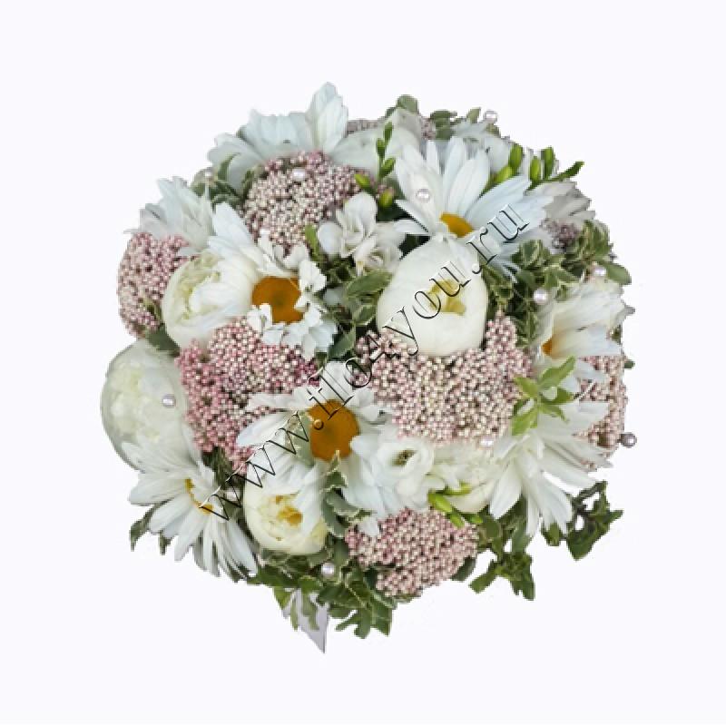 Букет невесты собран на своих стеблях, перевязан атласной лентой и украшен нежно-розовыми перламутровыми жемчужинами.