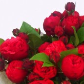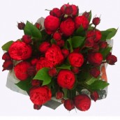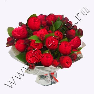 Яркий, пламенный букет из 15 кустовых пионовидных роз.