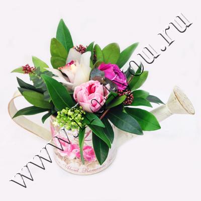 Нежная композиция с орхидеей в металлической леечке.