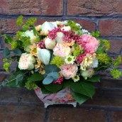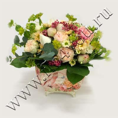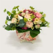 Композиция с пионовидной кустовой розой Пашмина в металлическом кашпо.