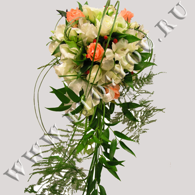 Каскадный свадебный букет на порт-букетнице из роз и лизиантуса.