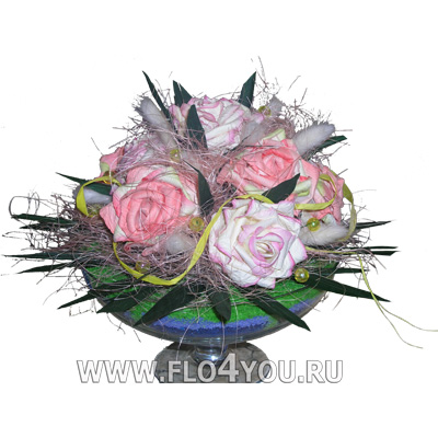 Композиция из искусственных роз с сухоцветами в стеклянной вазе с цветным песком