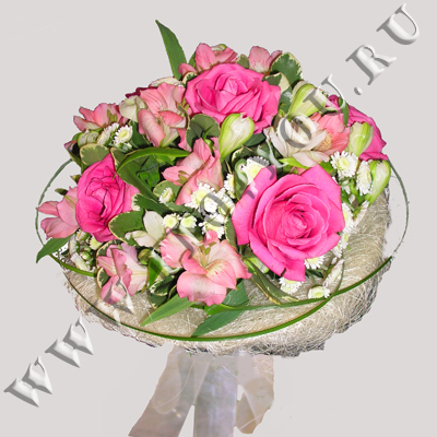 Букет выполнен без портбукетницы с использованием декоративного каркаса из сезаля.
