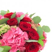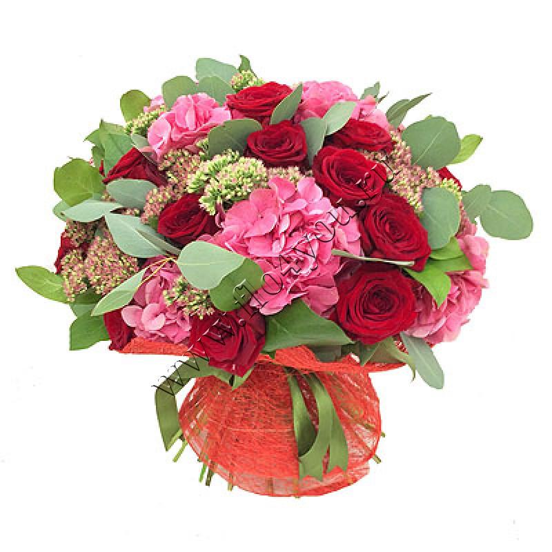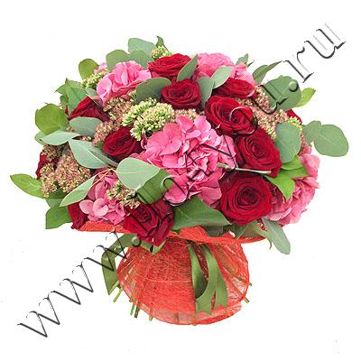 Классический букет из бордовых роз и розовой гортензии можно вручить и женщине, и мужчине.