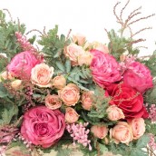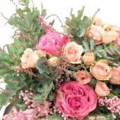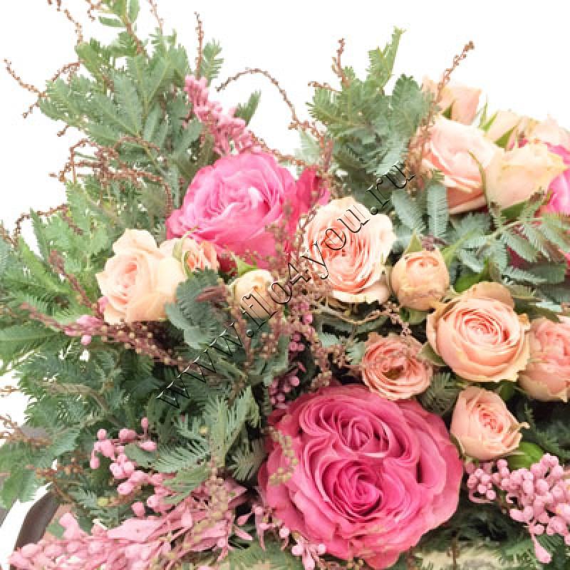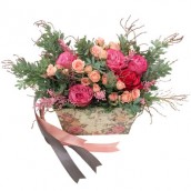 Очаровательная композиция в металлическом кашпо с кустовыми пионовидными розами Мисс Бомбастик.