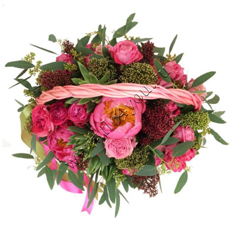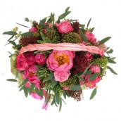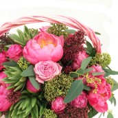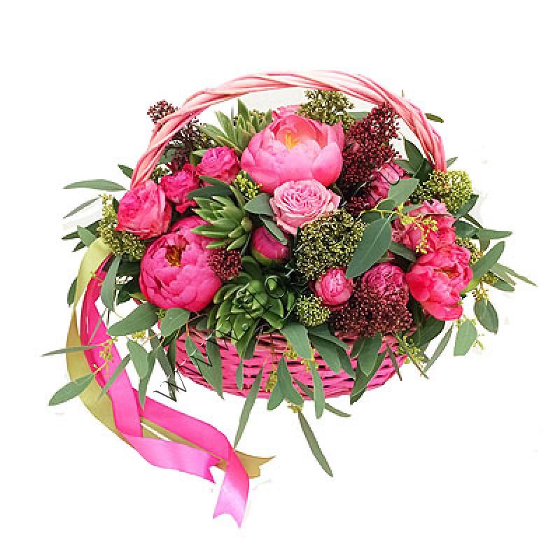 Корзина с коралловыми пионами и розами Мисс Бомбастик - ярко и торжественно.