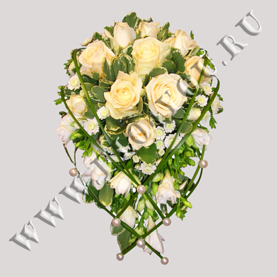 Каплевидный свадебный букет на порт-букетнице с кремовыми розами, оформлен переплетением из берграсса и бусинками.