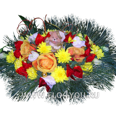 Композиция из живых цветов с новогодним мишкой