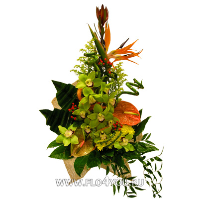 Этот красивый, яркий букет из экзотических цветов можно преподнести начальнику или партнеру по бизнесу