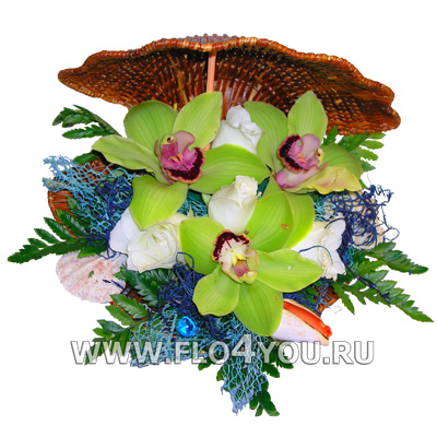 Эта необычная композиция в раковине состоит из живых орхидей и роз.