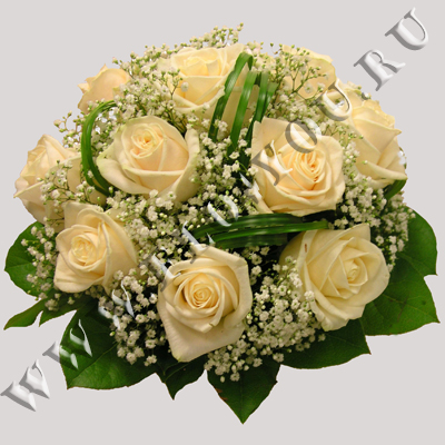 Круглый свадебный букет на порт-букетнице с розой сорта Венделла, оформлен берграссом.