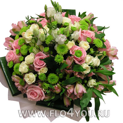 Круглый букет из различных сортов роз с добавлением хризантемы, альстромерии и декоративной зелени.