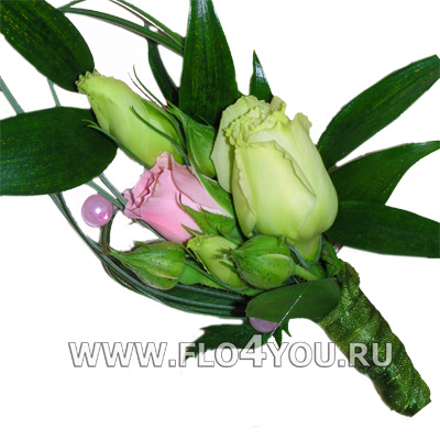 Бутоньерка из розовой кустовой розы и зеленого лизиантуса