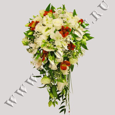 Каплевидный свадебный букет с белой розой и лизиантусом.