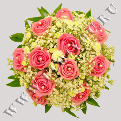 Букет выполнен на портбукетнице, ножка задекорирована белым атласом. Каждая роза украшена декоративной бусинкой.