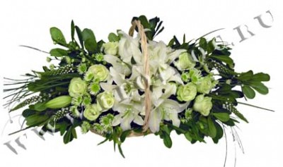 Композиция из белых лилий и зеленых роз очень трогательна.