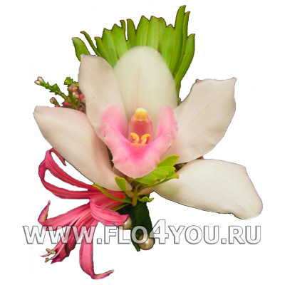Бутоньерка из орхидеи Цимбидиум и декоративной зелени