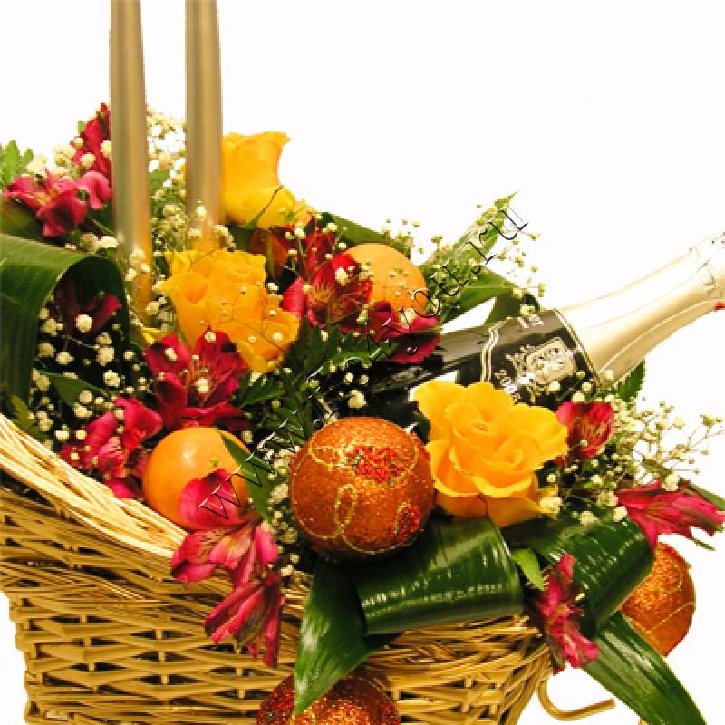 Композиция с живыми цветами, фруктами и шампанским (цена без учета стоимости шампанского).