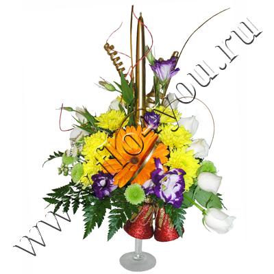 Композиция новогодняя в бокале «Мартини» с живыми цветами, игрушками и свечами.