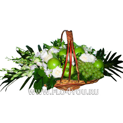 Шикарная корзина с зелеными яблоками и виноградом стильно смотрится в окружении кремовых роз и белой орхидеи Дендробиум.