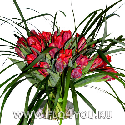 27 красных тюльпанов с декоративной зеленью – страстная любовь.
