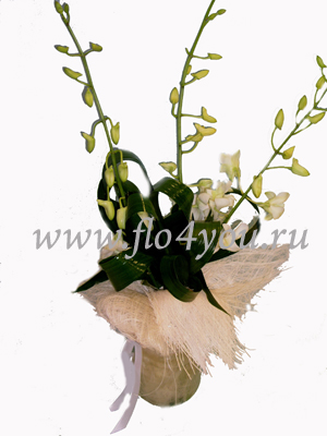 Букетик из орхидеи Дендробиум с добавлением декоративной зелени.