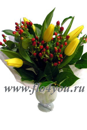 Небольшой круглый букетик из желтых тюльпанов и красного гиперикума.