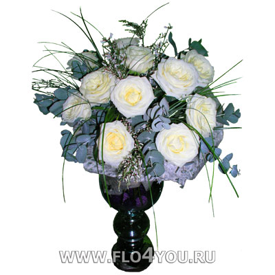 Букет из 11 белых роз с добавлением декоративной зелени.