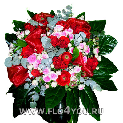 Букет из красных ранункулюсов и бело-розовой кустовой розы.