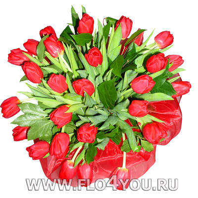 Букет из 31 ярко красного тюльпана в органзе.