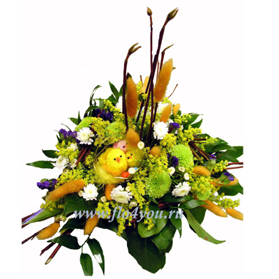 Небольшая пасхальная композиция в плетеной корзинке с цыплятами.