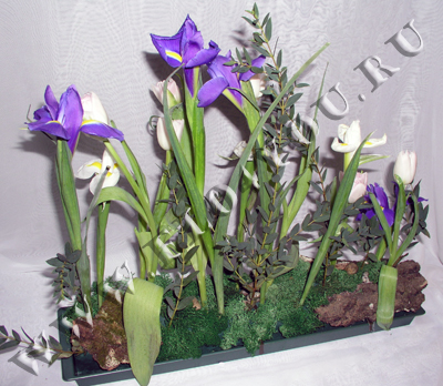 Оригинальная композиция из ирисов и тюльпанов «Заборчик».
