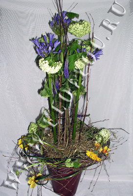 Высокая стильная композиция из синих агапантусов и зеленого вибурнума.