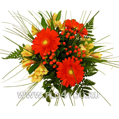 Небольшой круглый букетик из красных гербер и красного гиперикума.