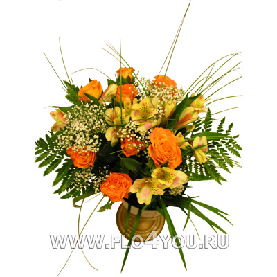 Небольшой круглый букетик из рыжих роз и альстромерии.