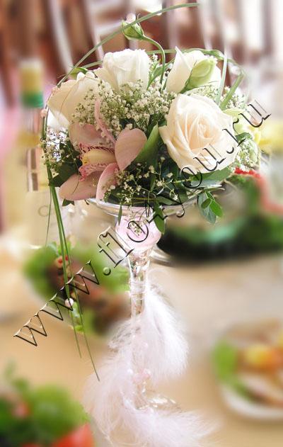Композиция на стол с кремовыми розами и розовой орхидеей в стеклянной вазочке.