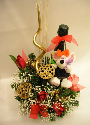 Новогоднее оформление бутылки шампанского живыми цветами и декоративными элементами.