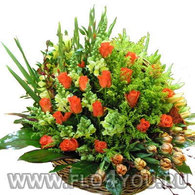 Композиция составлена группами из 14 различных видов цветов и декоративной зелени.