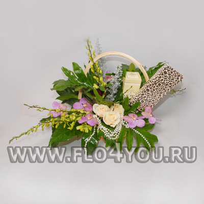 Элитная корзинка с коньяком и конфетами оформлена живыми цветами (цена указана без учета стоимости коньяка).