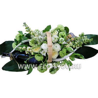 Корзина с вином и конфетами оформлена живыми цветами (цена указана без учета стоимости вина).