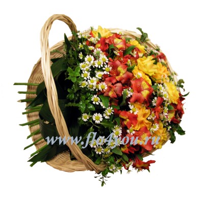 Создается впечатление, что яркий полевой букет положили в корзинку.