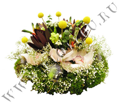 Интерьерная композиция из множества экзотических цветов оформлена натуральным мхом.