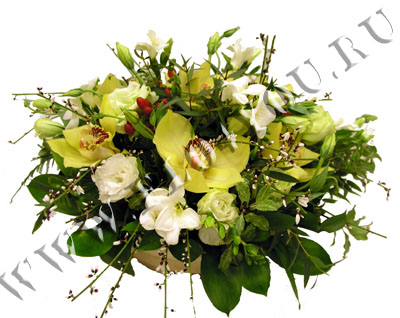 Интерьерная композиция в керамическом поддоне из множества экзотических цветов оживит и украсит любое помещение.