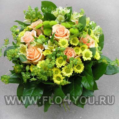 Букет из прекрасных роз дополнен другими декоративными цветами и зеленью.